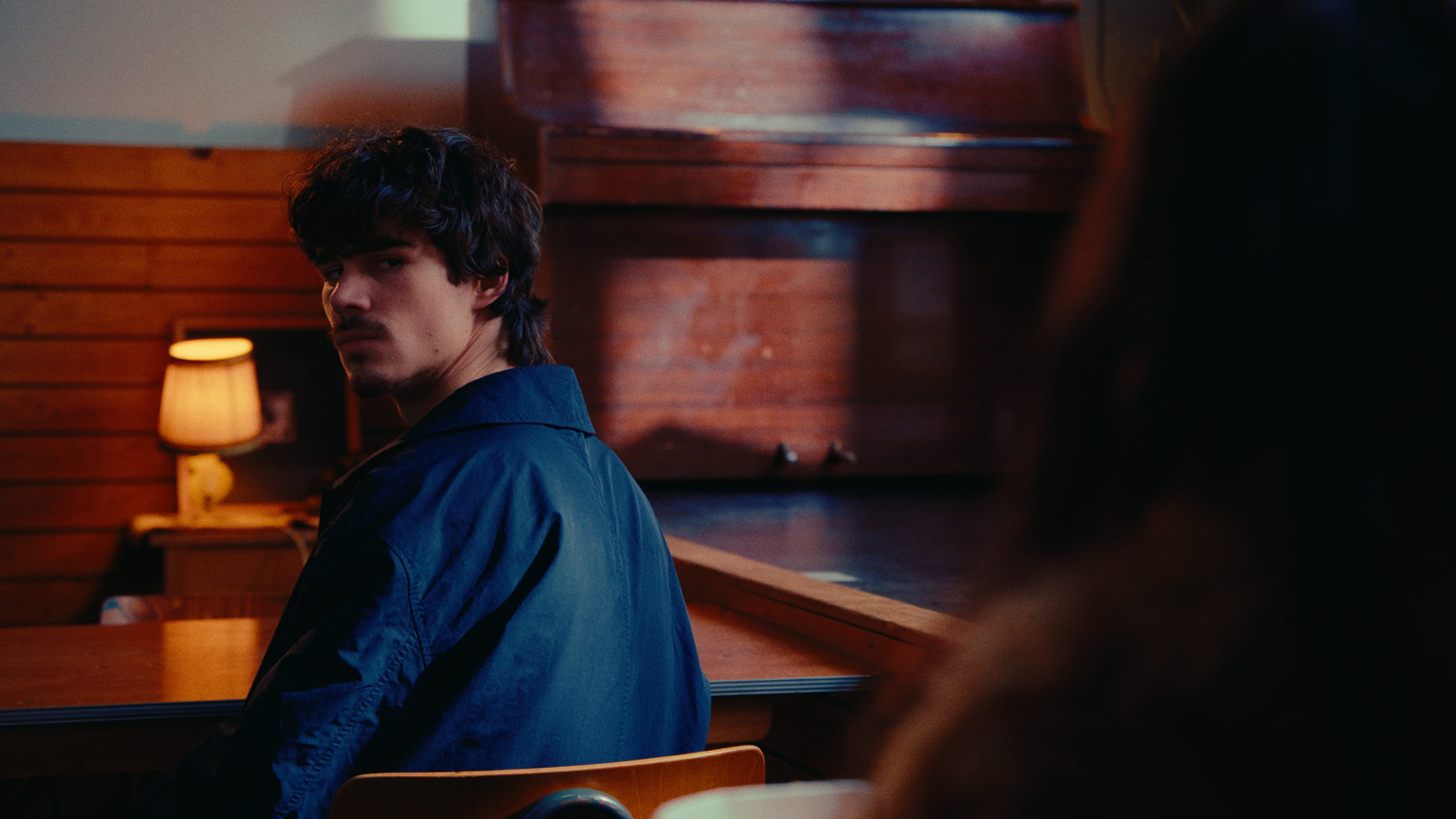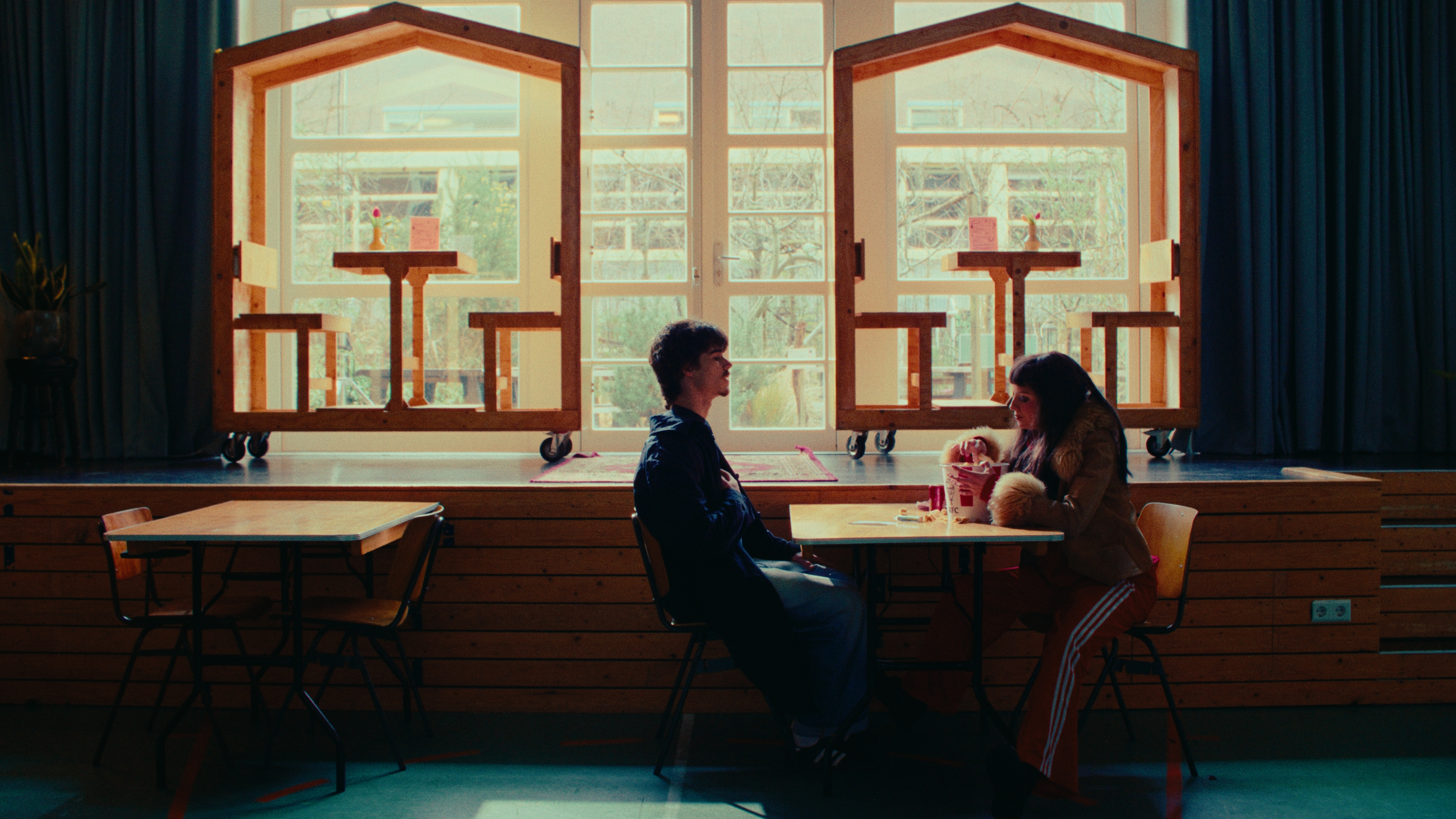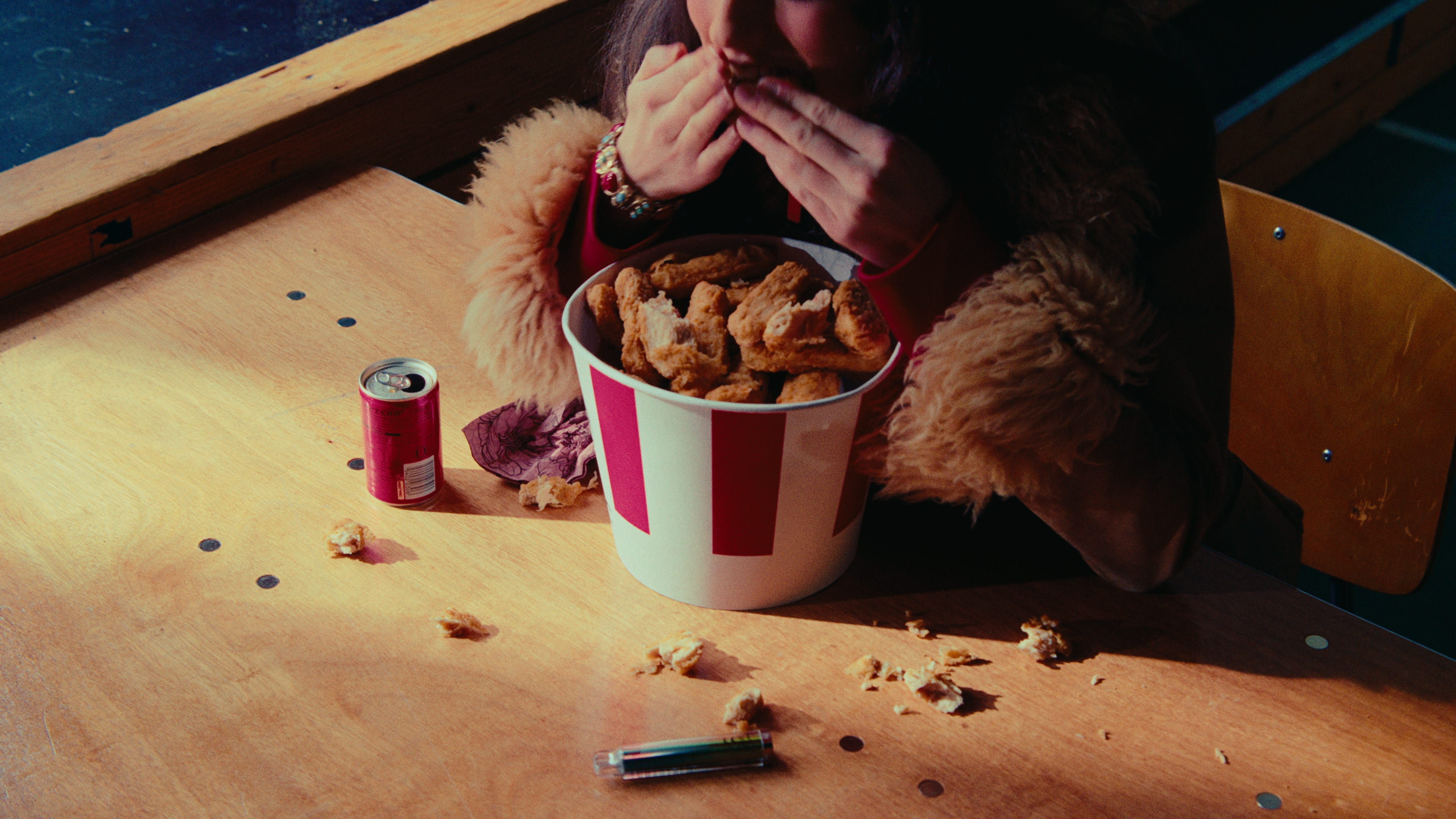 A young woman and a middle aged man cross paths while eating.